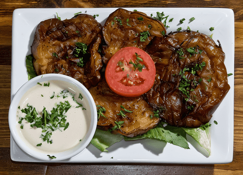 Баклажаны на гриле с йогуртовым соусом – изысканное блюдо греческой кухни, пропитанное ароматами Средиземноморья. Считается, что традиция жарить овощи на открытом огне пришла от древних греков, которые использовали свежие продукты и простые, но насыщенные вкусы. Баклажаны, подрумяненные на гриле, приобретают тонкий дымный аромат, а их нежная мякоть становится мягкой и сочной. Легкий, освежающий соус из йогурта с огурцом и лимоном добавляет блюду контраст, придавая ему кремовую текстуру и лёгкую кислинку. Гармония вкусов делает этот рецепт идеальным как для лёгкого обеда, так и для праздничного застолья. Подача с лимонными дольками завершает композицию, придавая ей свежесть. Этот рецепт — настоящее воплощение солнечного греческого вкуса, подчеркивающее простоту и натуральность ингредиентов.