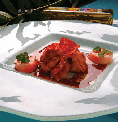Лисички с хрустящей салями в соусе из красного вина с тмином и кориандром — это изысканное блюдо, пропитанное духом греческой кухни. Нежные лисички, жаренные до совершенства, сочетаются с хрустящими ломтиками салями, создавая гармонию текстур. Соус из красного вина, насыщенный пряными нотками тмина и кориандра, добавляет блюду глубину вкуса и благородную терпкость. Костный мозг, томленный в ароматном бульоне, придаёт богатство и бархатистость каждому кусочку. Листья свежего орегано завершают композицию легкой свежестью, а морская соль подчёркивает все оттенки вкуса. Это блюдо идеально для особых случаев, когда хочется порадовать себя или гостей чем-то необычным, элегантным и с непревзойдённым ароматом.