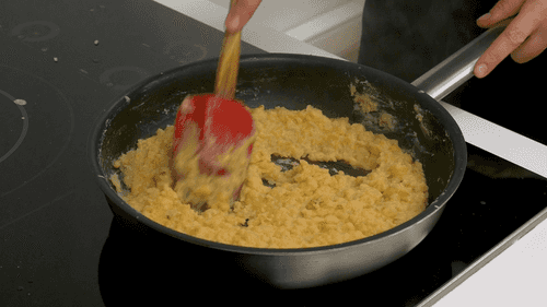Добавить в сковороду с луком разварившийся горох, перемешать и прогреть еще 5 минут. В конце посолить кашу по вкусу.