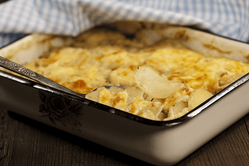 Сверху полить сливками и запечь до мягкости примерно 45 минут.