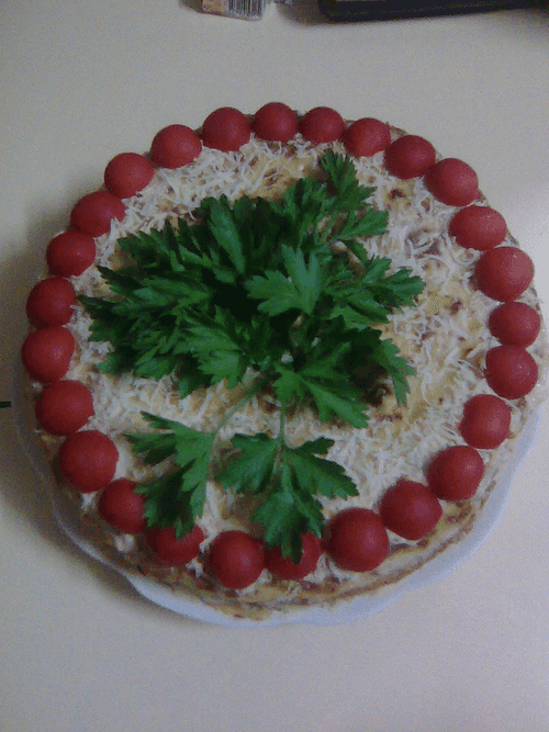 Коржики (наши блинчики) складывать друг на друга, обильно промазывая майонезным кремом, т.к. они будут хорошо впитывать крем.