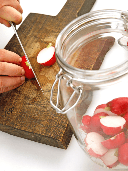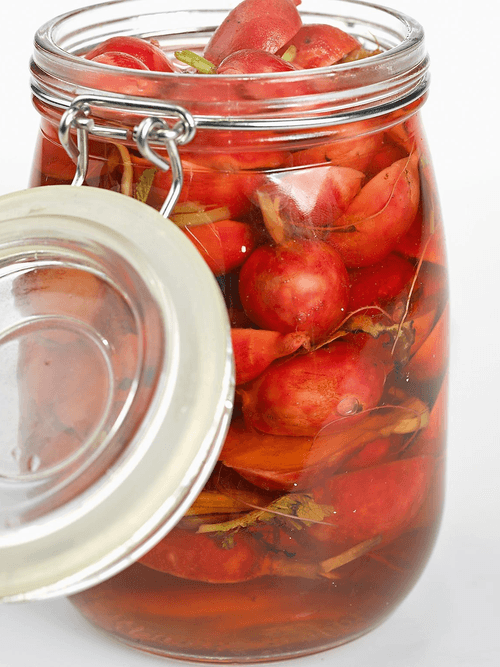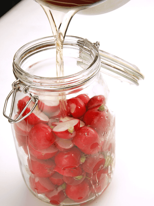 В сотейнике разогреть смесь из двух уксусов, красного и белого винного, воды и сахара (как и в предыдущих рецептах, соотношение смеси из двух видов уксусов должно быть один к одному с водой и сахаром). Подождать, чтобы сахар полностью растворился, затем дать полученной смеси остыть (горячей заливать нельзя, чтобы редис не сварился) и заполнить ею банку доверху. Закупорить ее и выдерживать три дня.