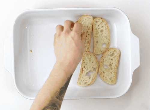 Выложить хлеб на противень.Подсушить в духовке минут 5 при 180 градусах.