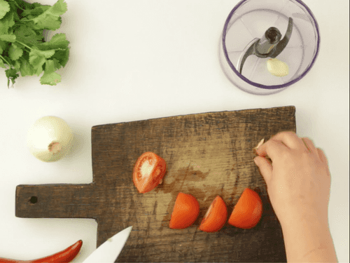 Помидоры очистить и мелко нарезать. Чили избавить от семян и измельчить вместе с луком, чесноком и кинзой. В большой ступке пестиком превратить чили, кинзу, помидоры и цедру лайма и лук в однородную пасту. Слегка посолить и снова перемешать.
