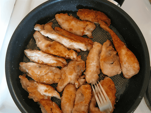 Обвалять в муке кусочки курицы. Жарить до готовности в зависимости от размеров кусочков.