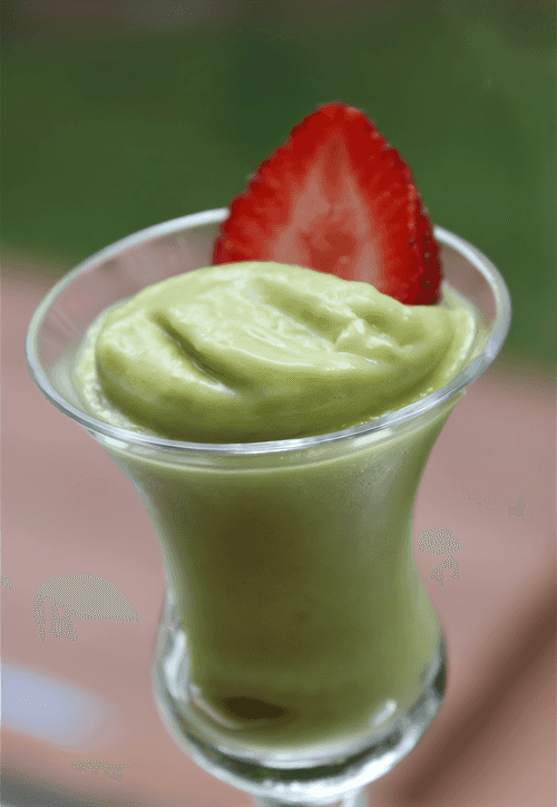 Загрузите в миксер дольки авокадо, сахар и лаймовый сок. Хорошо взбейте. Переложите получившийся крем в глубокую десертную тарелку. Подавайте дип со свежей клубникой.
