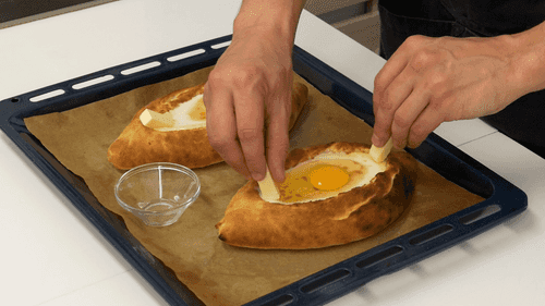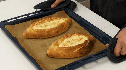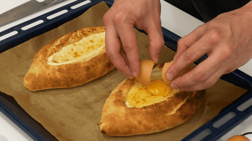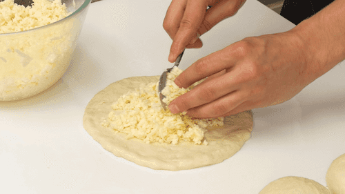 В середине каждого пирога осторожно растянуть тесто руками, сделать надрез и подвернуть края теста внутрь хачапури так, чтобы была видна начинка.