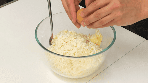 Смешать его с яйцом и добавить 20 грамм сливочного масла — если сыр жирный, можно обойтись и без масла: начинка должна быть достаточно рыхлой.