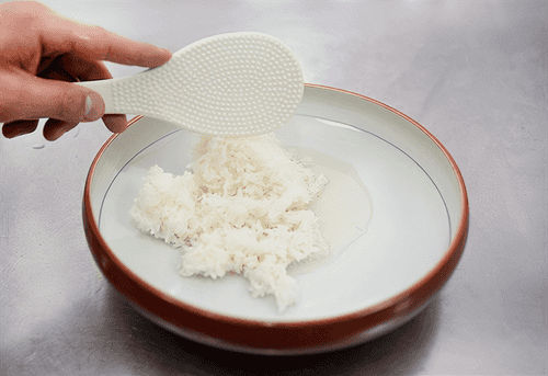 Готовый рис переложить в широкую миску, залить горячим рисовым уксусом и быстрыми движениями, аккуратно несколько раз перевернуть рис при помощи деревянной лопаточки. Не размешивать!