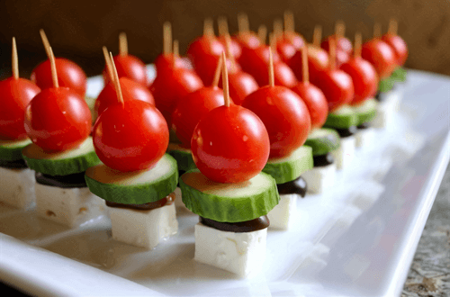 Нанизываем на зубочистку помидорку, кусочек огурца, половинку маслины и кубик феты.