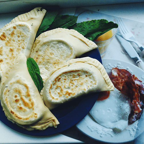 Выкладывать фарш на половину кружка теста, солить, перчить и сразу же защипывать кутабы в форме полукруга, стараясь, чтобы сок от зелени не попал на края. Обжаривать на сухой хорошо разогретой сковородке без масла по 2 минуты с каждой стороны.