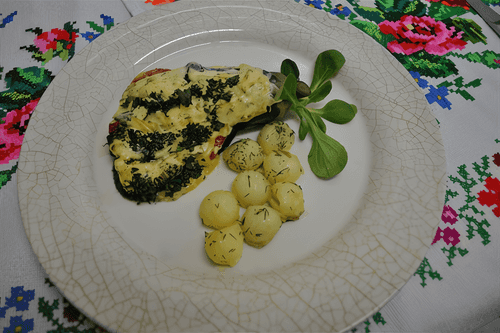 Баклажаны с помидорами и сыром — это яркое и аппетитное блюдо украинской кухни, которое сочетает нежность запеченных овощей с насыщенным вкусом сыра и ароматных специй. История этого рецепта уходит корнями в традиционную украинскую гастрономию, где свежие сезонные продукты всегда были основой кухни. Ломтики баклажанов сначала слегка припускают в соленой воде, затем прослаивают сочными помидорами и сыром, а сверху дополняют майонезом с укропом и чесноком. Завершающий штрих — запекание в духовке, что придаёт блюду золотистую корочку и насыщенный аромат. Подача с молодым картофелем делает его сытным и гармоничным. Такое блюдо идеально подходит как для уютного семейного ужина, так и для праздничного застолья, радуя гостей своим вкусом и аппетитным видом.