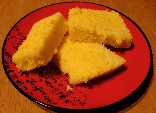 В поленту добавить сливочное масло и посолить. Хорошо перемешать и выложить в прямоугольную форму для застывания.