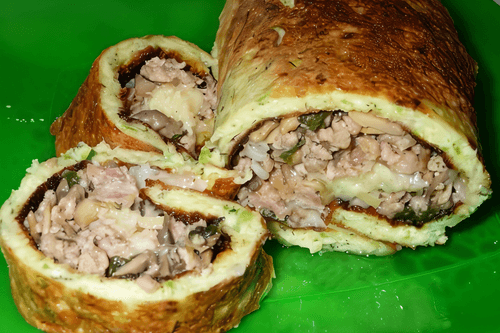 Рулет из кабачков с грибами и фаршем — это нежное и ароматное блюдо русской кухни, которое сочетает в себе легкость овощей и насыщенность мясной начинки. Кабачки, известные своим мягким вкусом, создают воздушную основу, а грибной и мясной фарш придают рулету сочность и насыщенность. Этот рецепт, возможно, вдохновлен традиционными русскими пирогами, где грибы и мясо — частые гости. Благодаря плавленому сыру начинка становится еще более кремовой, а свежий зеленый лук добавляет пикантную нотку. Блюдо идеально подходит для уютных семейных ужинов или праздничных застолий, где оно радует и вкусом, и нарядным видом. Подается нарезанным на порционные кусочки, украшенным зеленью или яркими овощами, что делает его не только вкусным, но и эстетически привлекательным.