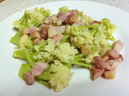 Добавляем к бекону цветную капусту. На этом этапе, если любите, можете добавить мелко порубленный чеснок. Все перемешиваем и поджариваем еще минут 5 (солить ничего не придется, так как в копченом беконе и так есть соль, но все равно ориентируйтесь на свой вкус). Все готово!