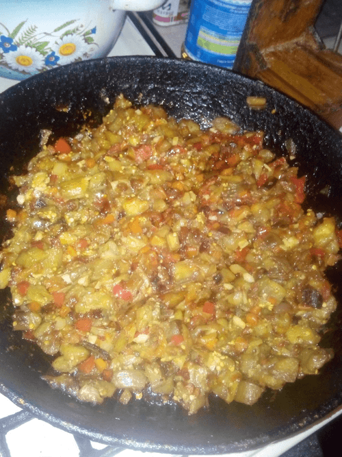 Отчистить баклажаны от кожуры, нарезать кубиками, посолить, дать немного постоять и обжарить на растительном масле до мягкости.