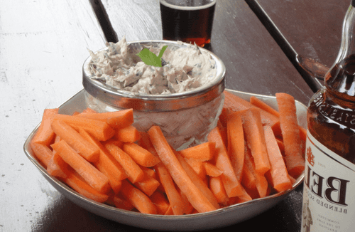 Для сервировки понадобится большое плоское блюдо: на него ставится маленький салатник с кремом из тунца, сыра и мяты, а рядом кладется морковь.