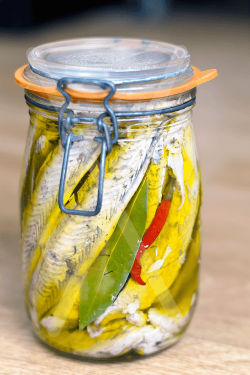 Филе сложил в стерилизованную в кипятке стеклянную банку вместе с лавровым листом, черным перцем горошком и сваренным перцем чили. На всякий случай подержал емкость с рыбой некоторое время в едва кипящей воде, но не долго.