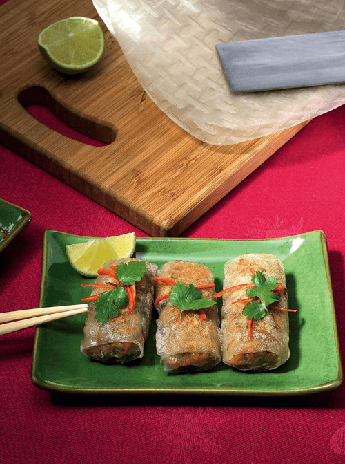 Для соуса тайский чили (2 г) и чеснок мелко нарубить, заправить соком лайма (10 мл), добавить 50 мл воды, 25 мл рыбного соуса и 20 грамм сахара. Рисовую бумагу размочить, свернуть роллы, обжарить на сковороде, подавать с соусом и кинзой.