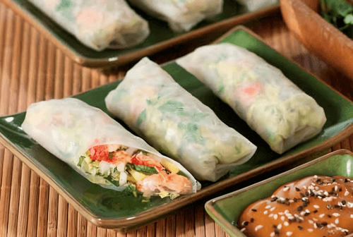 Накройте начинку нижним краешком листа и осторожно сверните роллы.