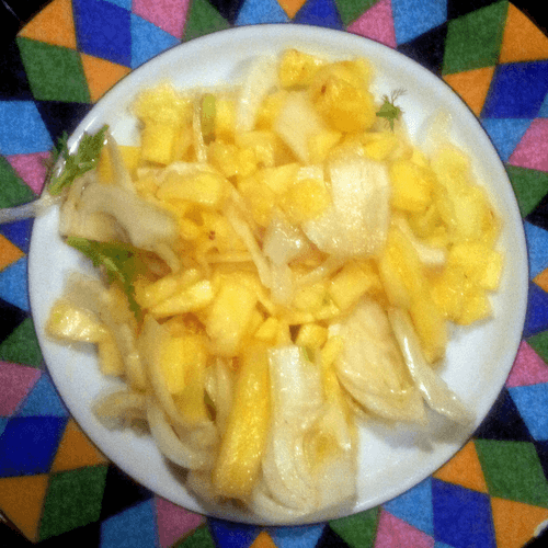 Взять примерно одинаковое количество фенхеля и ананаса, все почистить и порезать тонкими ломтиками (можно нашинковать, если есть чем).