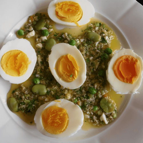 Яйца с зеленым соусом из петрушки, бобов и горошка – изысканное блюдо средиземноморской кухни, сочетающее свежесть зелени и нежность яиц. Этот рецепт восходит к традициям регионов, где зелень и морепродукты играют ключевую роль в кулинарии. Насыщенный соус, приготовленный из петрушки, бобов, горошка, анчоусов и каперсов, создает богатый вкусовой ансамбль – он одновременно свежий, солоноватый и слегка пикантный. Уксус добавляет легкую кислинку, а оливковое масло придаёт бархатистую текстуру. Блюдо идеально подходит для легкого обеда или праздничного стола, где оно сможет удивить гостей своим гармоничным балансом вкусов и аппетитным видом. Украшенные свежими бобами и горошком, яйца выглядят особенно привлекательно и становятся настоящим украшением стола.