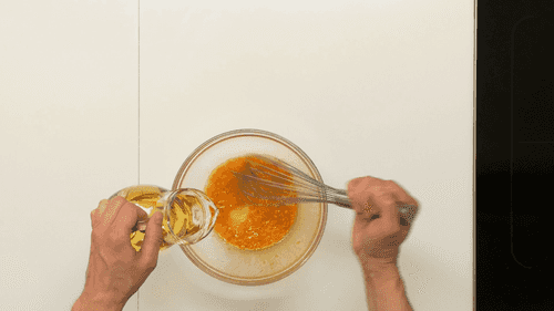 Постепенно и небольшими порциями влить подсолнечное масло, взбивая венчиком или ложкой, точно так же, как делают майонез. Масло может быть любым растительным — главное, чтобы оно было рафинированным и не имело запаха.