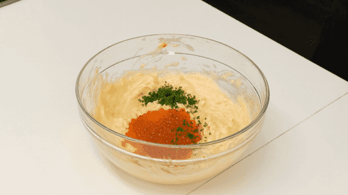 Мелко нарезать и вмешать лук-резанец, вмешать и оставшуюся икру — аккуратно, чтобы теперь она как раз не лопалась.