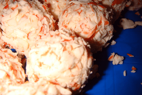 1 чайную ложку сырной массы размять в лепешку, положить на нее маслинку и скатать в шарик. Внутрь маслины можно положить орех. Получившиеся шарики обвалять в крабовых стружках.