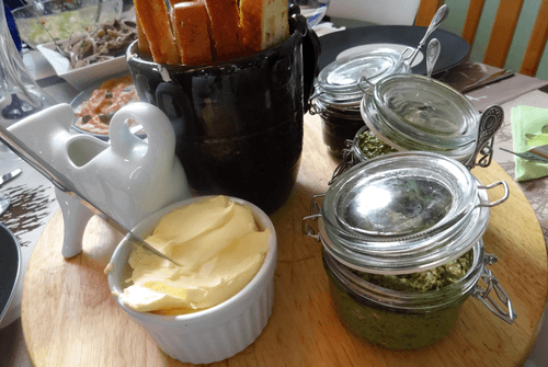 На крутящуюся плату в аутентичных баночках поставить 3 соуса, положить чиабатту, сливочное масло и в соуснике поставить хорошее оливковое масло с бальзамиком (3:1).