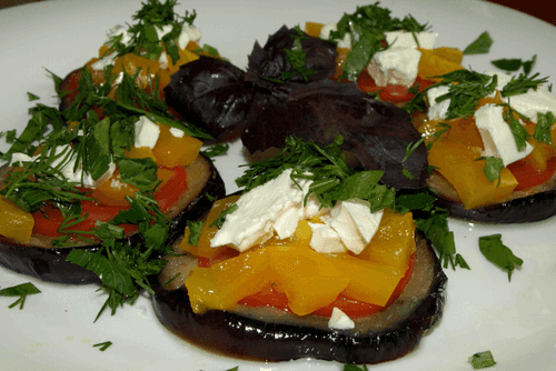 Запеченные баклажаны с болгарским перцем, помидорами и брынзой
