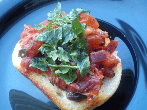 Намажьте кусочки чиабатты тонким слоем бальзамического крема, выложите помидоры с луком и посыпьте петрушкой.