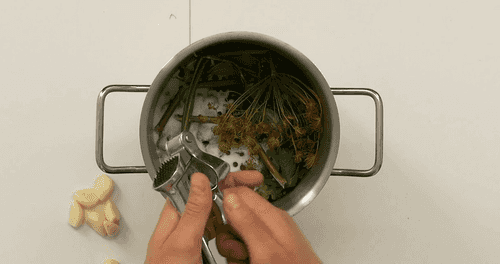 Раздавить через давилку чеснок.