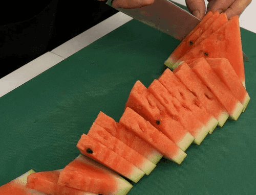 Арбуз вместе с коркой нарезать небольшими треугольными ломтиками.