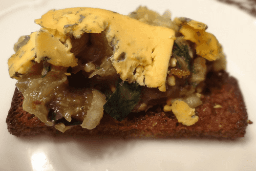 Икру раскладываем на тосты, сверху кладем кусочек сыра (с плесенью — камамбер, бри), подаем как закуску.