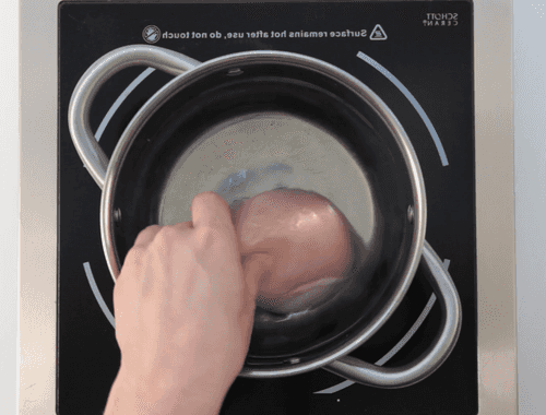 Курицу залить холодной водой, поставить на сильный огонь и довести до кипения. Как только вода закипит, убавить огонь и варить около десяти минут. Готовность можно проверить, разрезав большой кусок, — внутри не должно быть крови. Готовое мясо остудить.