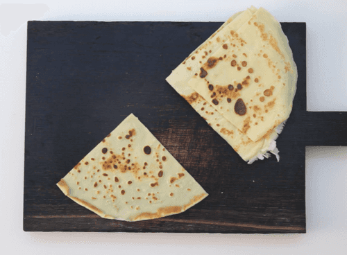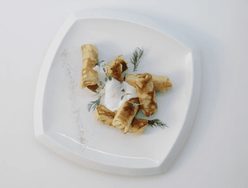 Каждый блинчик разрезать на четыре или шесть частей в зависимости от размера. В каждую часть положить по столовой ложке начинки и аккуратно свернуть в трубочку.