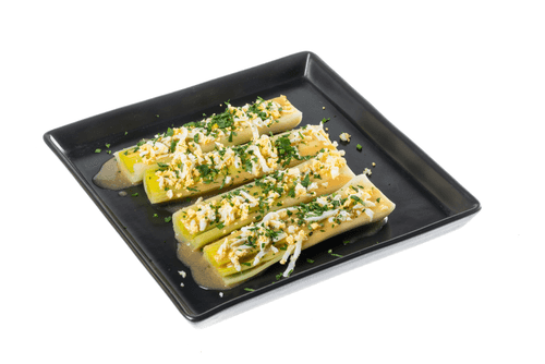 Разделить порей на 4 порции, полить соусом, посыпать рубленой петрушкой и натертым вареным яйцом.
