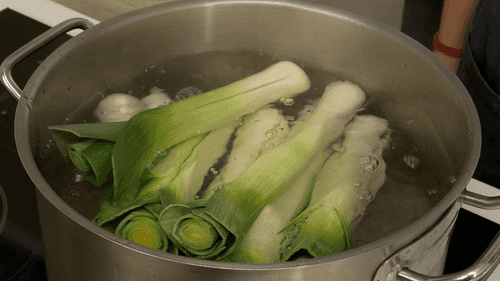 Надрезать порей, отступив примерно 2 см от основания и не доходя до самой макушки. В сотейнике вскипятить подсоленную воду, забросить лук и варить примерно шесть минут. После чего достать порей, обдать ледяной водой, аккуратно дорезать, чтобы получились половинки, и выложить их на бумажное полотенце, чтобы избавиться от лишней воды.