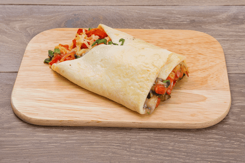 Разогрейте в глубокой сковороде на среднем огне 2 столовые ложки подсолнечного и сливочное масло, влейте яичную смесь; в центр выложите гренки, сверху — овощной соус, присыпьте тертым сыром и базиликом и подержите на огне 2–3 минуты, чтобы омлет схватился, затем сверните конвертом.