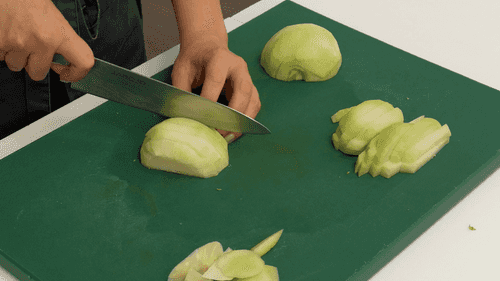 Кольраби очистить от кожицы, нарезать крупными брусочками (размером примерно 1 на 5 сантиметров).