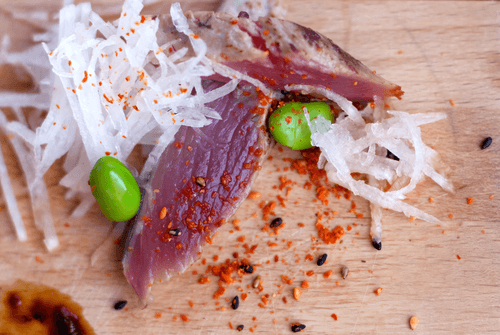 Татаки из тунца бонито – изысканное блюдо, вдохновлённое традиционной японской техникой обжаривания рыбы. Его корни уходят в японскую кухню, но благодаря простоте и великолепному вкусу оно завоевало популярность по всему миру. Обжаренное на открытом огне филе тунца сохраняет нежность внутри, а лёгкая копчёность придаёт пикантную нотку. После резкого охлаждения мясо приобретает плотную текстуру, идеально подходящую для нарезки. Подаётся с дайконом, васаби и соусом понзу, что добавляет свежести и глубины вкуса. Это блюдо ценят за баланс между нежностью тунца и остротой специй. Татаки — это не просто способ приготовления, а целая философия минимализма, позволяющая раскрыть истинный вкус продукта. Идеально для гурманов, стремящихся к гармонии в еде.