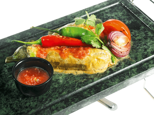 Выложить баклажан на блюдо, щедро полить соусом. Добавить перец чили, половину помидора, половину красной луковицы. И то, и другое, и третье можно использовать в свежем виде, но лучше поджарить без масла. Завершить композицию веткой кинзы и плошкой с острым томатным соусом.