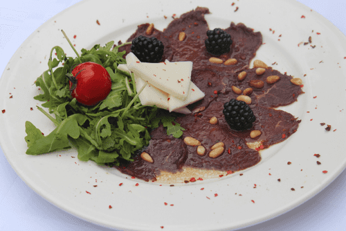 Карпаччо из северного оленя с козьим сыром и рукколой