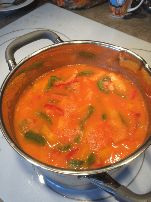 Добавить к помидорам нарезанный болгарский перец, дать покипеть 7 минут.