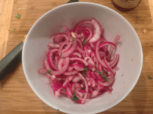 Маринованный красный лук с мятой – изысканное дополнение к блюдам европейской кухни, которое придаёт им свежий и насыщенный вкус. Яркий и сладковатый красный лук смягчается воздействием малинового уксуса, приобретая пикантную кислинку. Ароматная свежая мята добавляет нотку свежести и лёгкости, превращая этот маринад в универсальное украшение для мясных и овощных блюд, салатов и бутербродов. Простота приготовления и утончённость вкуса делают этот рецепт идеальным как для повседневного использования, так и для особых случаев. Этот лук не только обогащает гастрономический опыт, но и радует своим аппетитным цветом, превращая любую трапезу в эстетическое наслаждение.