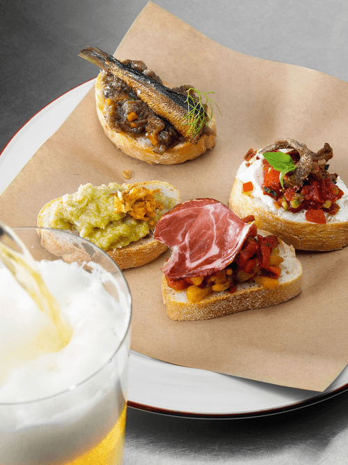На каждую брускетту выложить сладкий перец, сверху — ломтик коппы.