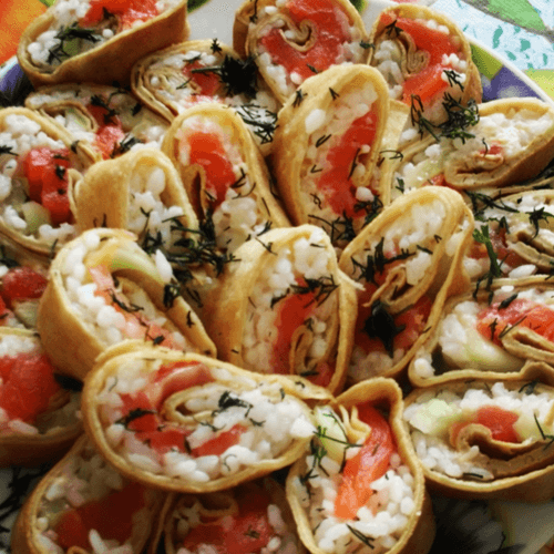 Роллы из блинов со сливочным сыром, семгой и авокадо