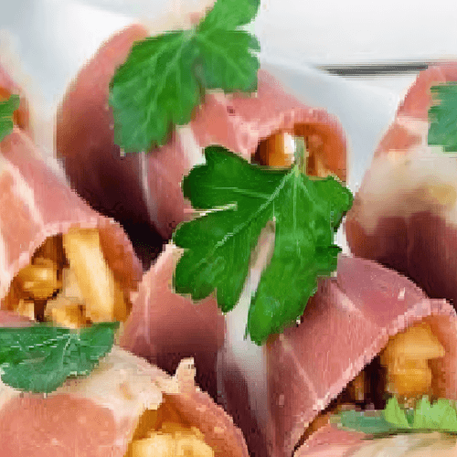 Рулетики из хамона с острым арахисом – изысканная европейская закуска, которая сочетает нежность сыровяленого окорока с пикантной остротой арахиса, чеснока и чили. Хамон – гордость испанской кухни, известный своей глубокой, насыщенной вкусовой гаммой. В этом рецепте он приобретает новый оттенок благодаря хрустящей ореховой начинке с легкой обжаркой, раскрывающей теплые, пряные ноты. Закуска идеально подходит для аперитива, сопровождая бокал красного вина или коктейль. Простота приготовления и богатство вкусов делают эти рулетики универсальным угощением – будь то праздничный стол или уютный вечер с близкими. Украшенные зеленью, они привносят гармонию цвета и аромата, очаровывая с первого взгляда и укуса.