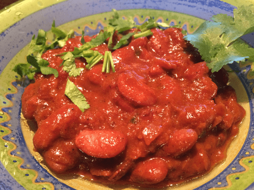 Получившуюся томатную массу смешать с измельченной зеленью, гарам-масалой, лимонным соком и фасолью в скороварке. Посолить, поперчить и залить половиной стакана воды. На сильном огне довести до кипения, готовить, не накрывая крышкой, две минуты. Подавать с рисом басмати.